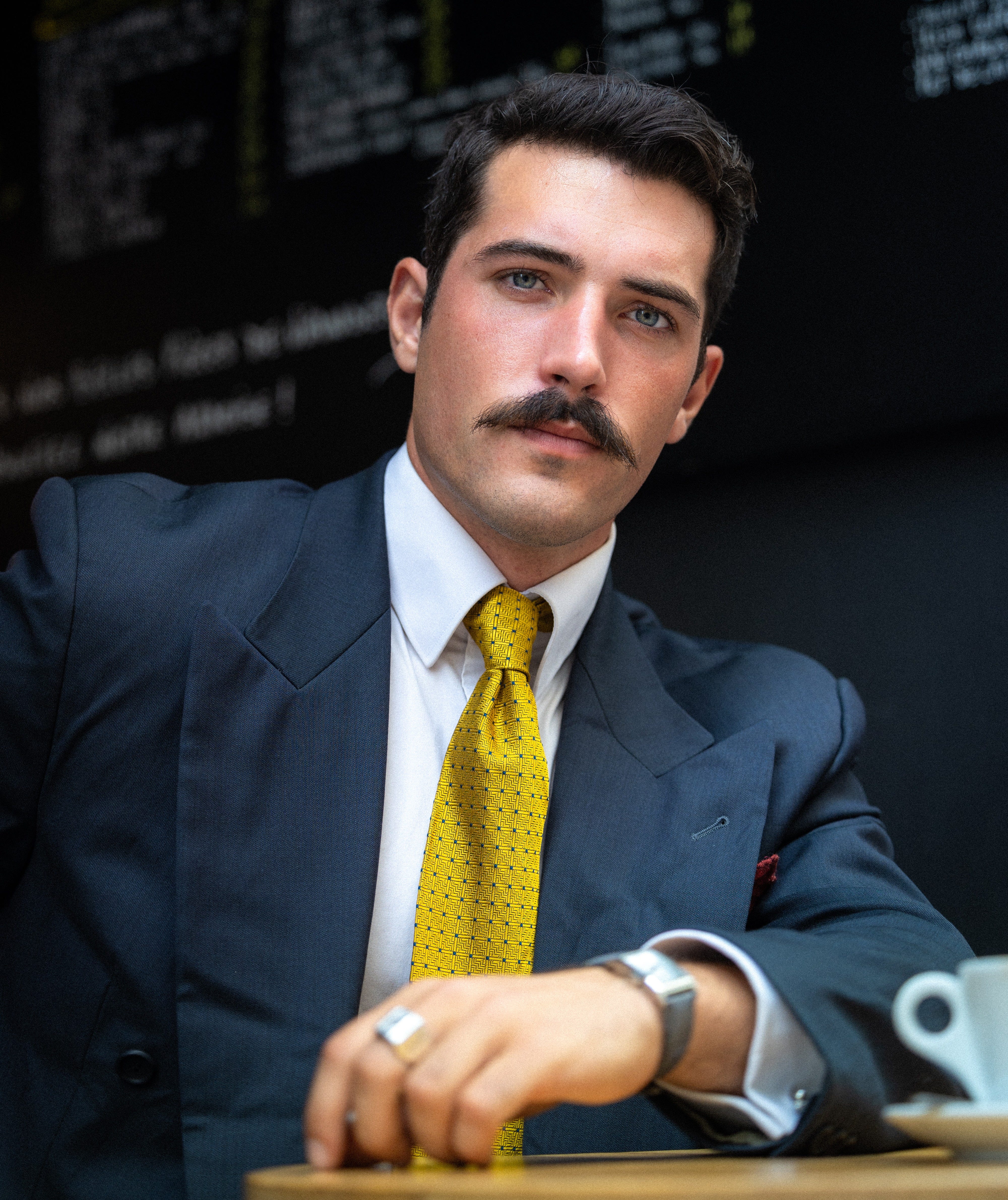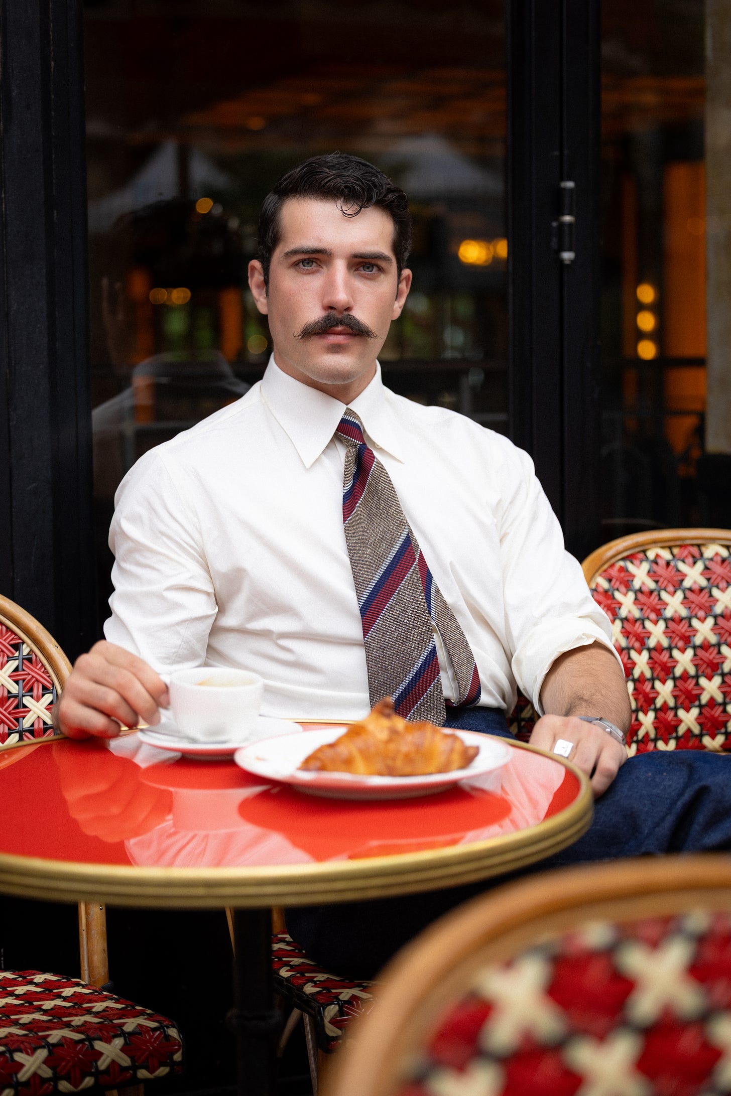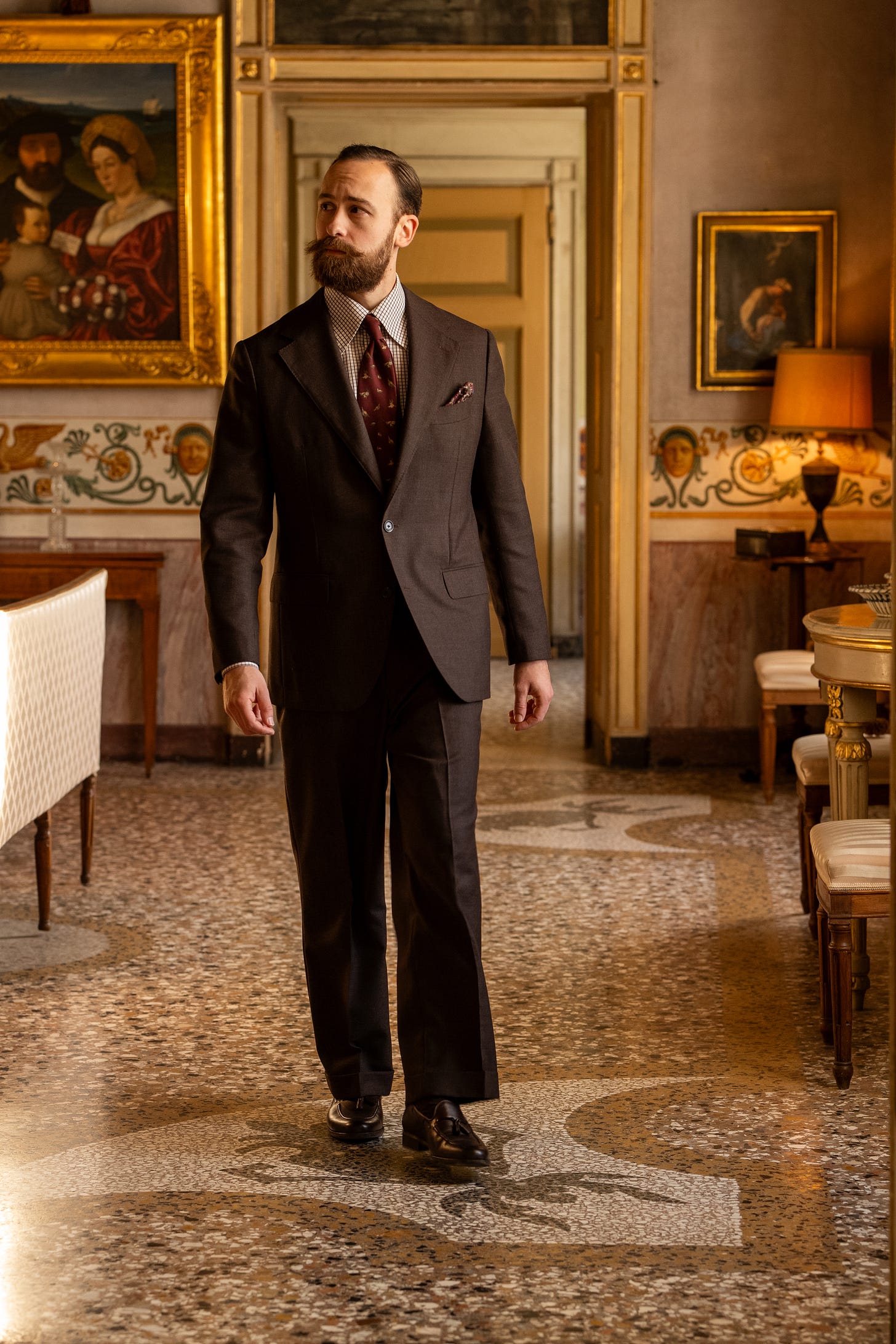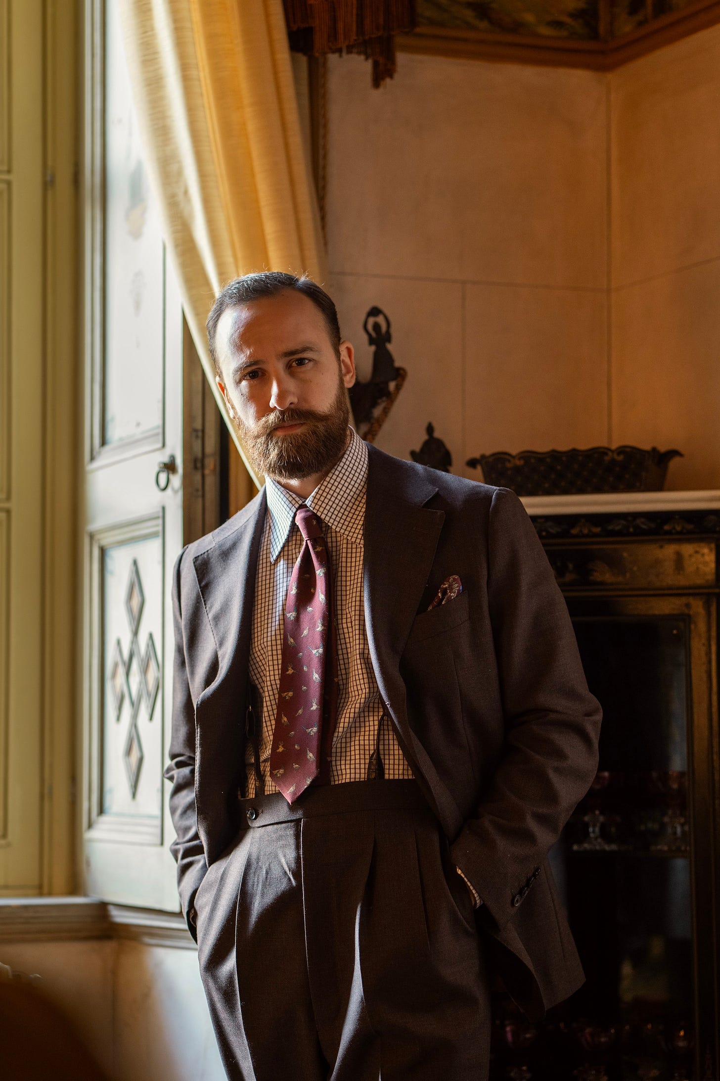 In the photo above, notice how Vincent’s white collar against his gray jacket creates a higher degree of contrast, and how this works well for him. For me, however, the checkered white and brown shirt is a safer bet. From that anchor, my tie and pocket square (or pochette, for our continental readers) then follow suit, adding to the layers of visual distinction without creating stark contrast.