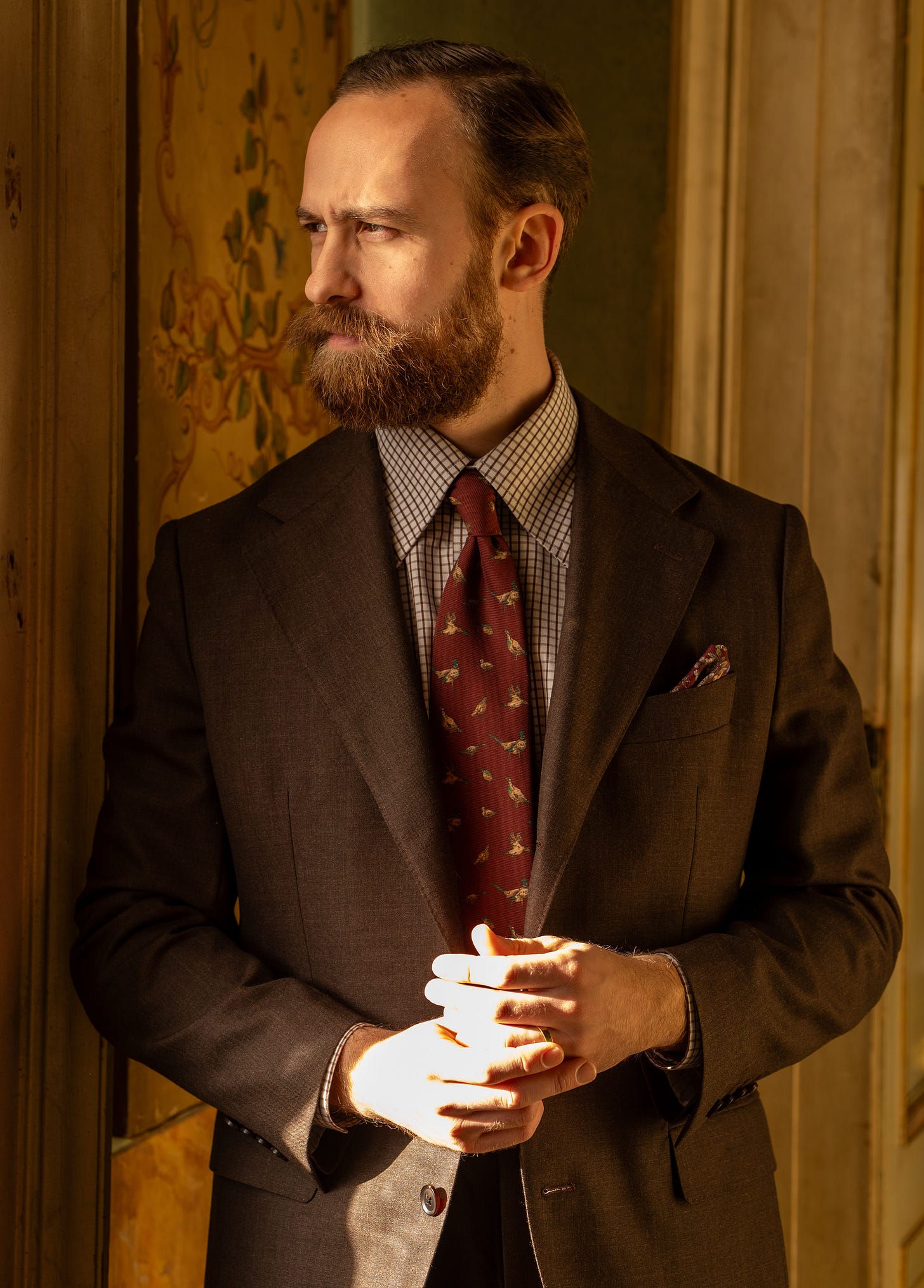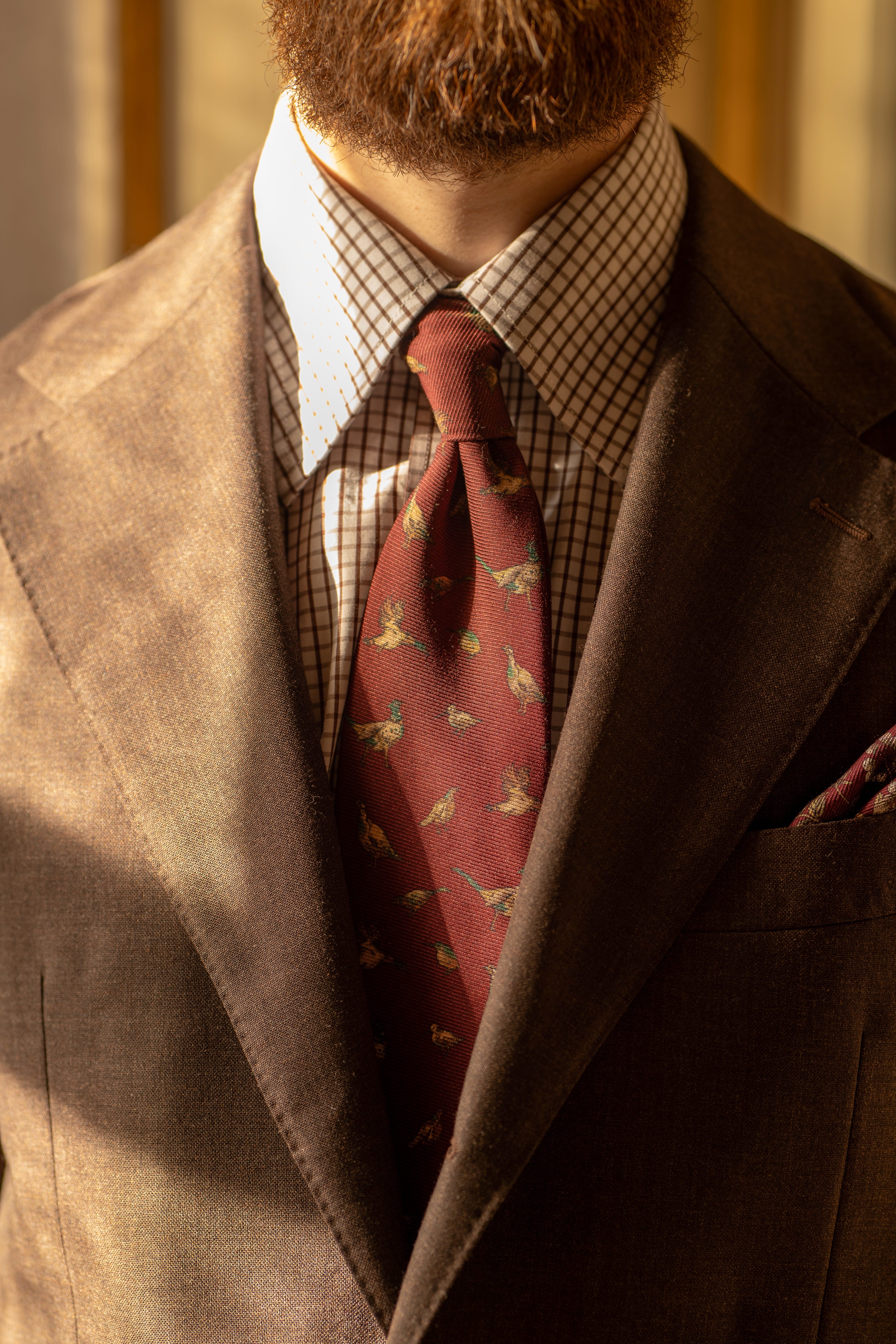 For me, this tie picks up on all the right colors: the muted burgundy reflects my face’s warm undertones, and the feathers of the waterfowl recall the natural color of my skin. The color green, to the extent that it is present, runs warmer rather than cooler, thus keeping in harmony with the overarching whole.