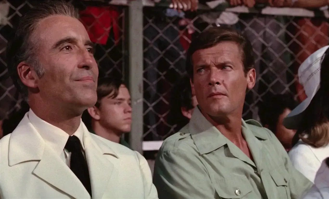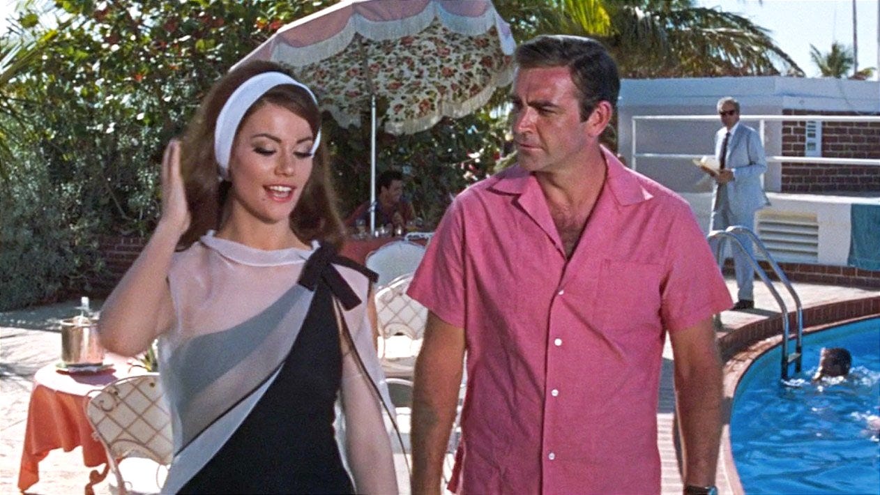 The early Bond films see 007 visit Jamaica, the Bahamas, Istanbul, Thailand, Venice, and other warm-weather, exotic locales. On each occasion, we get to see Bond (and often his enemies) shed the suit and don something more casual, though always elegant.