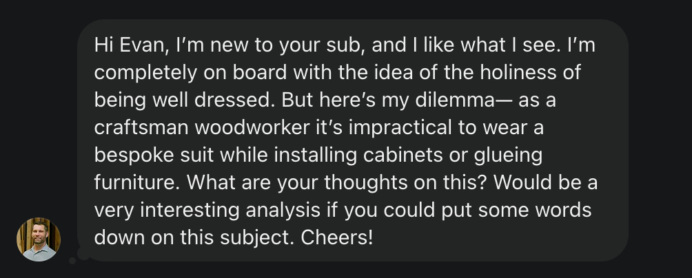 The suit is considered by many to be the ne plus ultra of menswear. It’s elegant, refined, and classic. But for a large majority of men, it’s also impractical. A message I received earlier this week illustrates why: